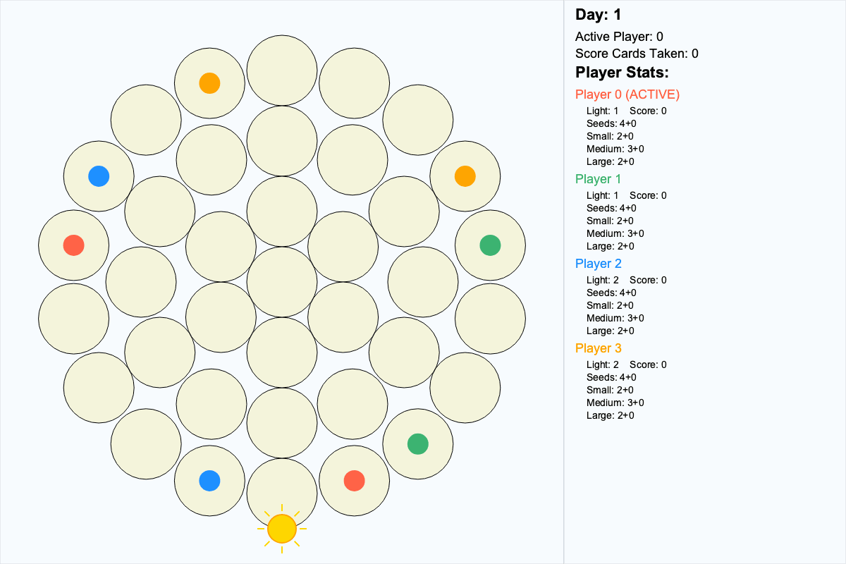 Photosynthesis is a four-player game played on a hexagonal grid of spaces. The aim is to get the highest score by the end of the game. Your score accumulates when a tree is harvested.